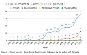Figure 1 shows the evolution in numbers of women elected to the Chamber of Deputies in Brazil since 1933, the first election in which women could vote and be voted for. It is possible to see the under-representation of women in general, who to date have not even reached a fifth of those elected (out of a total of 513 seats) and, above all, the disparity between them and the group of Black women, who are even more pro foundly under-represented, remains (Aflalo 2024).
